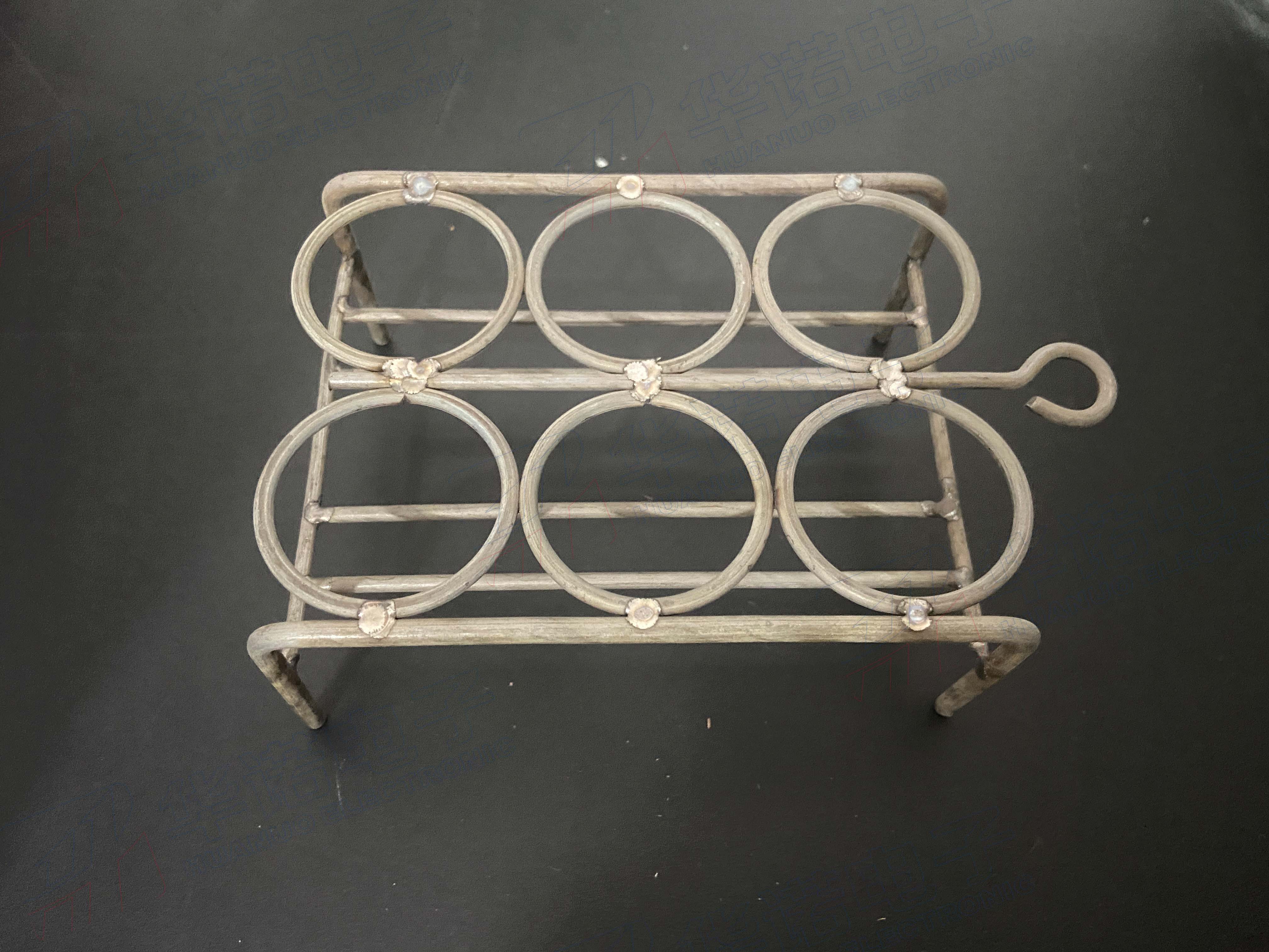 坩堝架:用鎳鉻絲或其他耐熱金屬絲制成。其規(guī)格尺寸以能使所有的坩都在馬弗爐恒溫區(qū)內(nèi),并且坩堝底部緊鄰熱電偶熱接點(diǎn)上方(見(jiàn)圖5)。