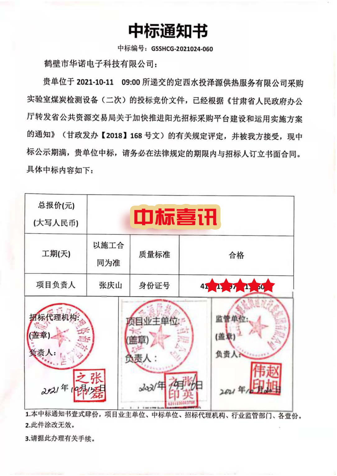恭喜我司(鶴壁市華諾電子科技有限公司)在定西水投澤源供熱服務(wù)有限公司采購實驗室煤炭檢測設(shè)備招標(biāo)項目中:憑借過硬的產(chǎn)品質(zhì)量,扎實高效的工作作風(fēng),卓越的運作團隊和良好的企業(yè)信譽,以絕對優(yōu)勢順利中標(biāo)。在此特向全國新老用戶及代理商朋友通報喜訊。