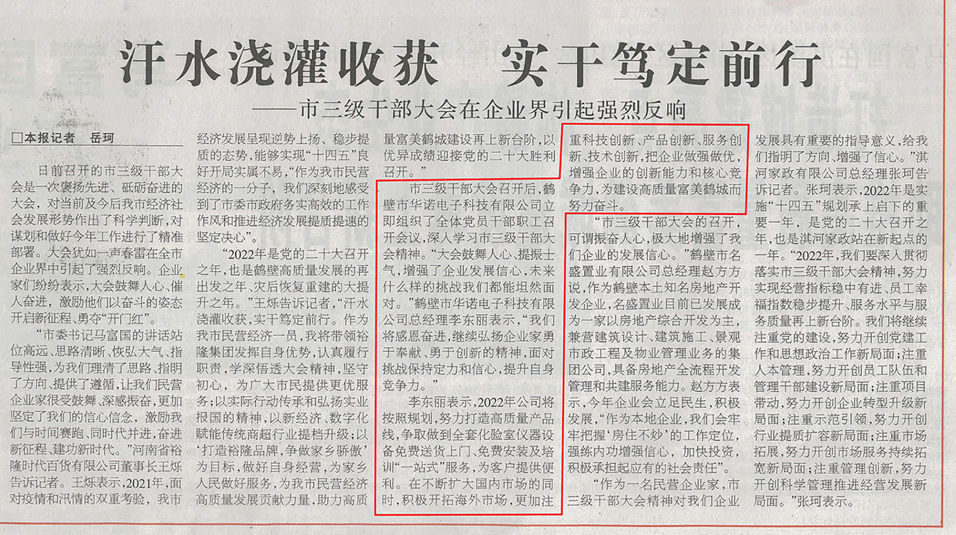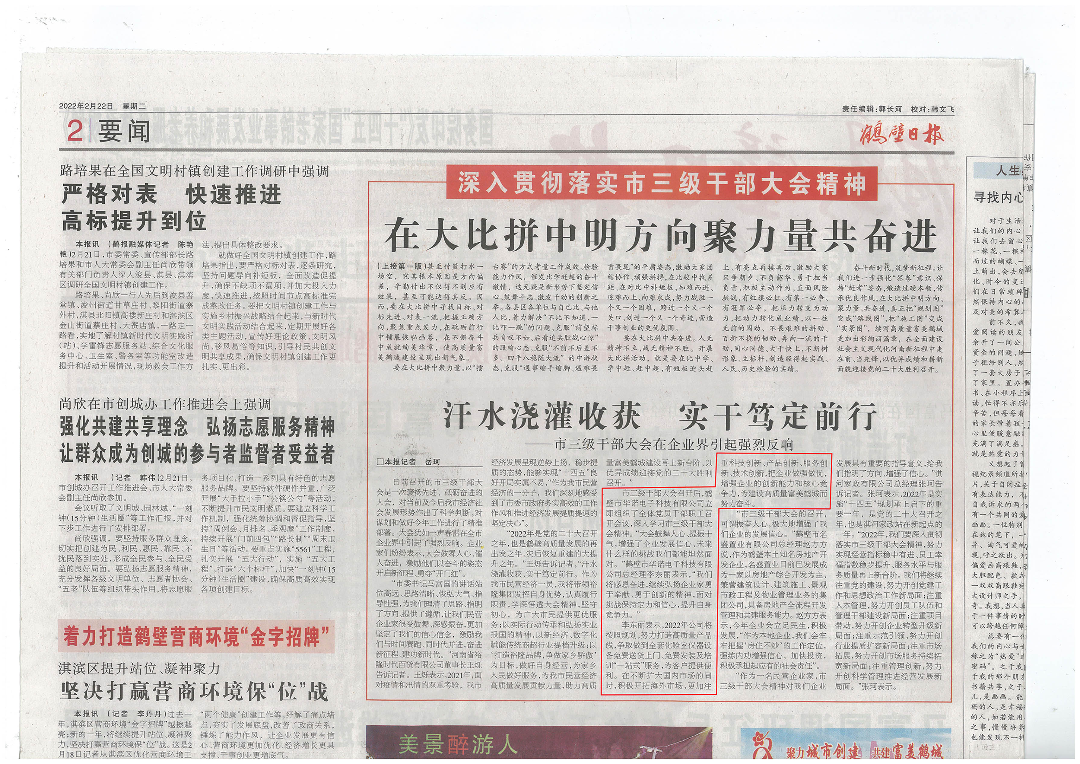 近日,為學(xué)習(xí)貫徹鶴壁市三級(jí)干部大會(huì)精神,鶴壁市華諾電子科技有限公司全體黨員干部積極參加。作為煤炭化驗(yàn)設(shè)備行業(yè)優(yōu)秀企業(yè),鶴壁日?qǐng)?bào)針對(duì)此次會(huì)議對(duì)華諾電子進(jìn)行報(bào)道。