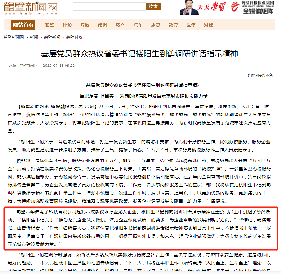 近日,省委書記樓陽生到鶴調(diào)研,作為我市煤質(zhì)儀器行業(yè)龍頭企業(yè),很榮幸受邀鶴壁日報(bào)社記者采訪,公司銷售部張慶山在采訪中提到“作為一名銷售人員,我將認(rèn)真把樓陽生書記到鶴調(diào)研講話指示精神落實(shí)到日常工作中,不斷增強(qiáng)本領(lǐng)能力,履職盡責(zé)、擔(dān)當(dāng)實(shí)干,在深耕國內(nèi)煤質(zhì)儀器市場的同時(shí),積極開拓海外市場,和大家一起把企業(yè)做強(qiáng)做優(yōu),為我市新時(shí)代高質(zhì)量發(fā)展示范城市建設(shè)貢獻(xiàn)力量。”